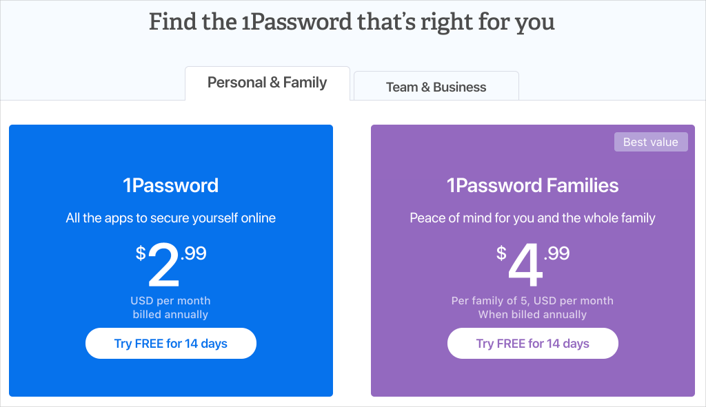 In this step, you’ll decide which 1Password plan is most appropriate. For individuals, 1Password costs $2.99 per month, or 1Password Families is $4.99 per month for a family of five. For businesses, 1Password Teams adds features and admin controls for $3.99 per user per month, or 1Password Business provides significantly more admin controls for $7.99 per user per month. You can compare the individual and family accounts, along with the Teams and Business plans, but if you’re still unsure which to pick, ask us for help.